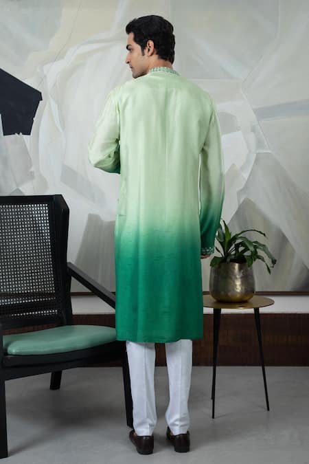 Green ombre silk kurta featuring thread and rexin work with a mandarin collar. Paired with contrast ivory malai cotton pant pyjama.