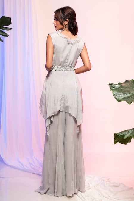 Grey Sharara Georgette, Top Chinon Sequin Work Peplum Tunic And Hipster Pant Set