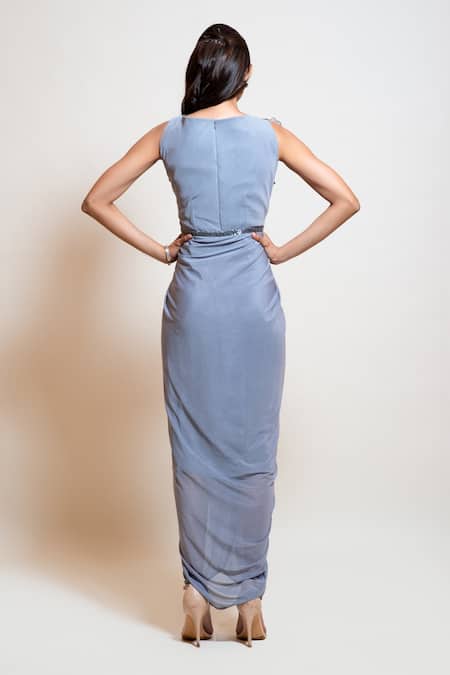 Ice grey lycra draped gown with attached crepe lining, pleated drapes, wired 3D monotone flowers embellishment & bead work waist.