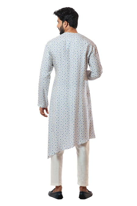 Ivory & blue front cut overlap kurta with all-over printed motifs & asymmetric hem. Paired with ivory pyjama pant.