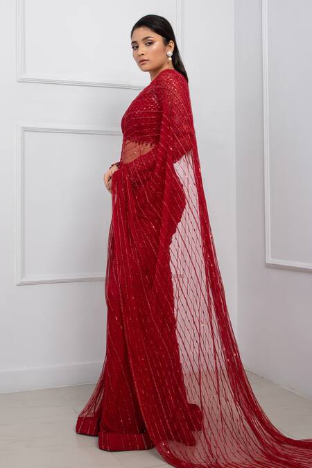 Red pre-draped saree made from net and crepe featuring sequin and bead embellishments in stripe patterns. Accompanied by a padded blouse with a cut-out back design.