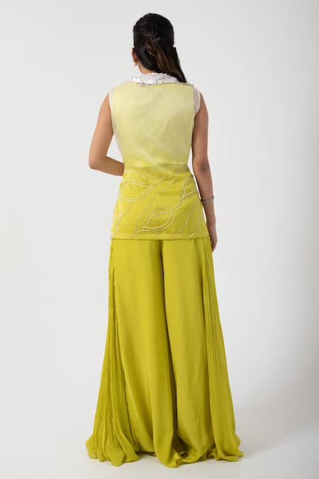 Green Organza, Crepe, Chiffon Sequins, Embellished Ombre Jacket Flared Pant Set