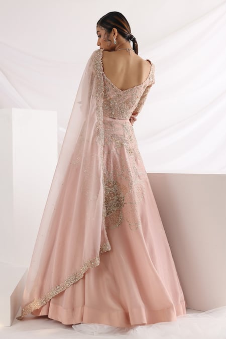 Pink lehenga featuring floral, bead, and gota embroidery with an attached cancan. Paired with a padded blouse and a sheer embroidered dupatta with a cutwork border.