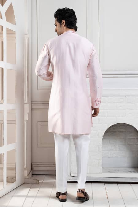 Pink Chanderi fabric kurta featuring stylized embroidery and a mandarin collar. Paired with malai cotton pants for a complete look.