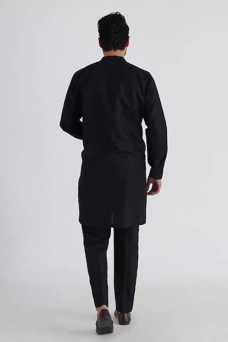 Black kurta featuring stitchline placement embroidery on the yoke. Paired with matching black pant made from malai cotton.