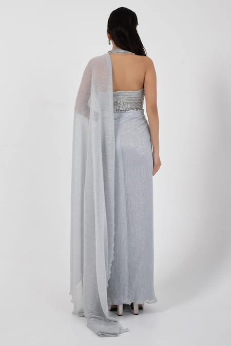 Grey pre-draped saree with a pleated textured base and an embellished padded blouse. The blouse features sequin and bead work with a halter neck design.