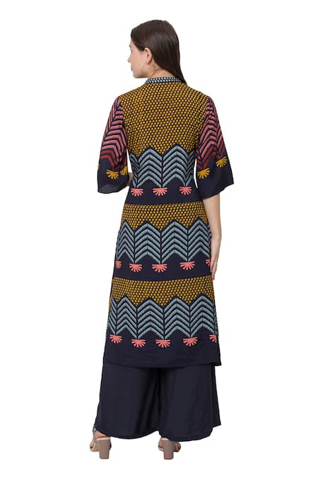 Black paneled kurta with printed motifs. Paired with palazzo.