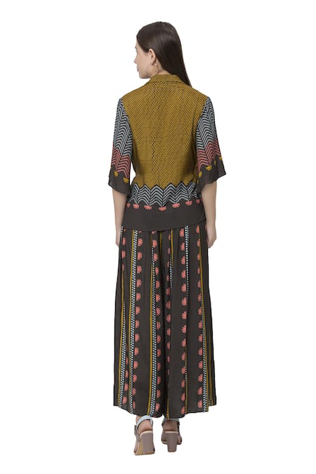 Black overlap kurta with printed motifs & side tie-up. Paired with palazzo.