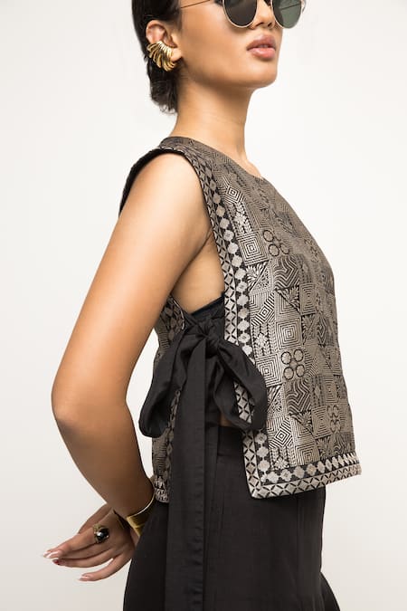 Black bib top featuring side tie-ups and an all-over geometric brocade pattern. Paired with a box pleated pant with contrast and brocade hem.