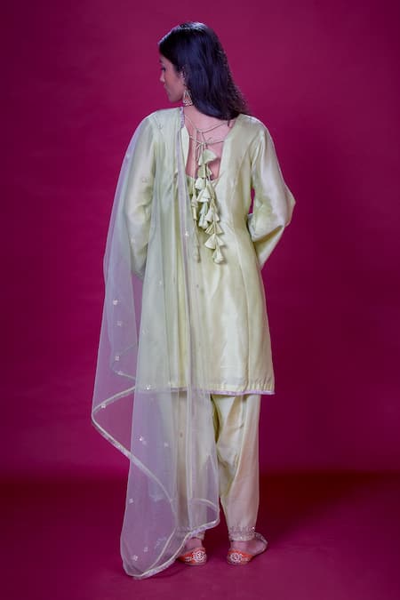 Lime green kurta with aari, kasab, sequin embroidery. Paired with salwar & net dupatta.