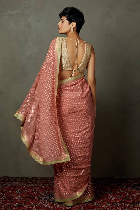 Pink silk saree featuring all-over bandhani print with a sleeveless blouse. The saree has a length of approximately 5.5 meters and a V neck design.