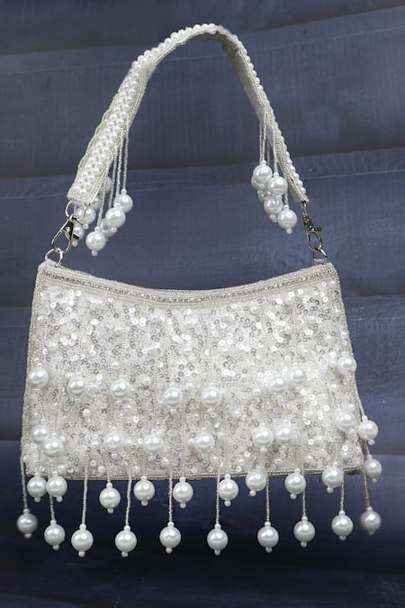 White handbag featuring all-over tonal sequin and pearl embellishments. Comes with a pearl embellished handle.