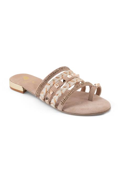 Beige leather heels featuring stones and crystal embellishments with braided accents