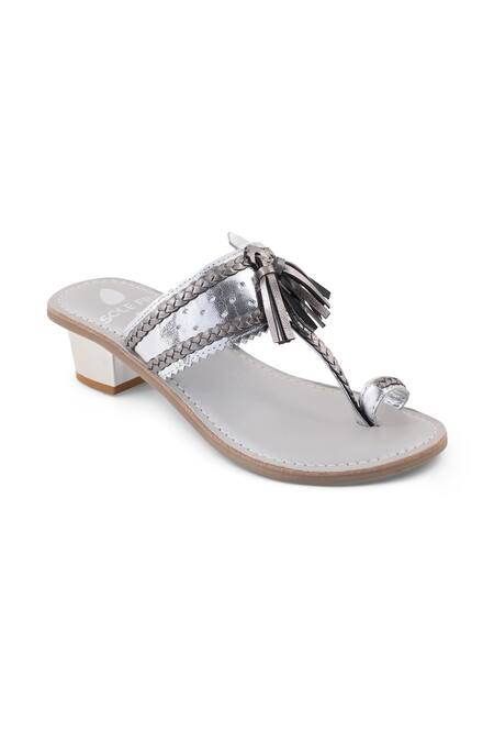 Silver kolhapuri block heels featuring braided straps and tassel applique