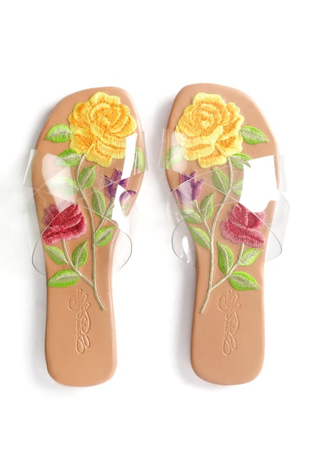 Beige Clear Strap Embroidered Sliders