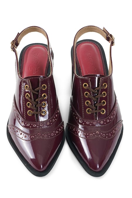 Deep maroon block heels featuring stud embellishment and pointed toe detailing