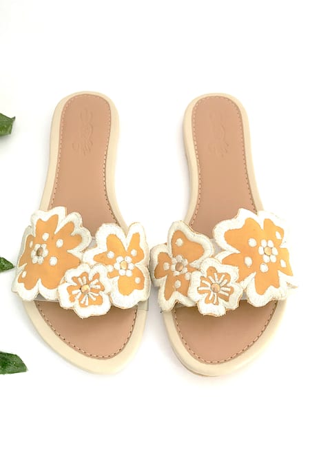 Yellow sliders featuring 3D floral motif work and cutwork detail