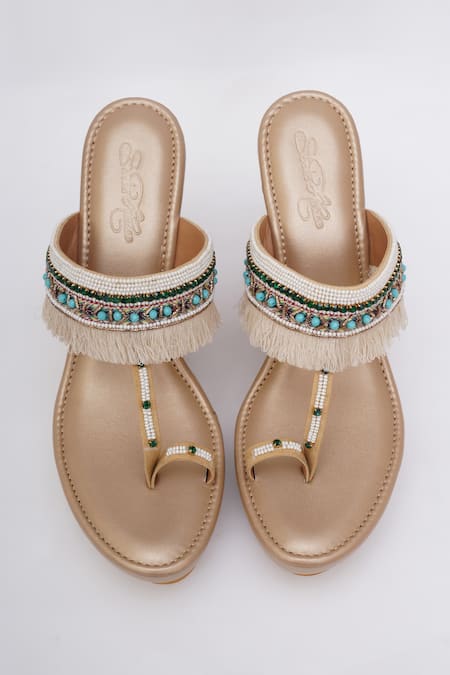 Gold embellished fringe wedges featuring bead and stone work with a toe ring