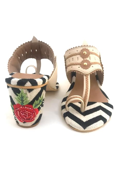 Beige Kolhapuri wedges featuring multi-color floral motif thread work and black-white chevron detail