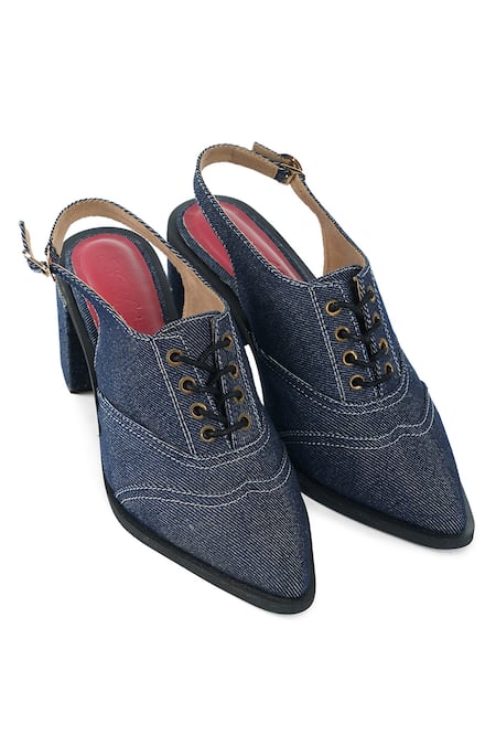 Blue block heels featuring stitchline embroidery and a pointed toe design