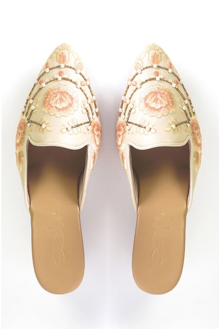 Beige Embroidery, Pearls Vegan Leather Pointed Toe Mules