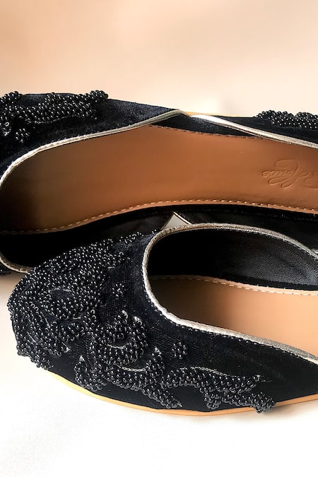 Black juttis featuring all-over bead work and silver piping detail