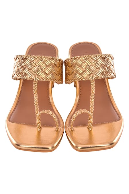 Gold kolhapuri heels featuring basket woven detailing and toe ring