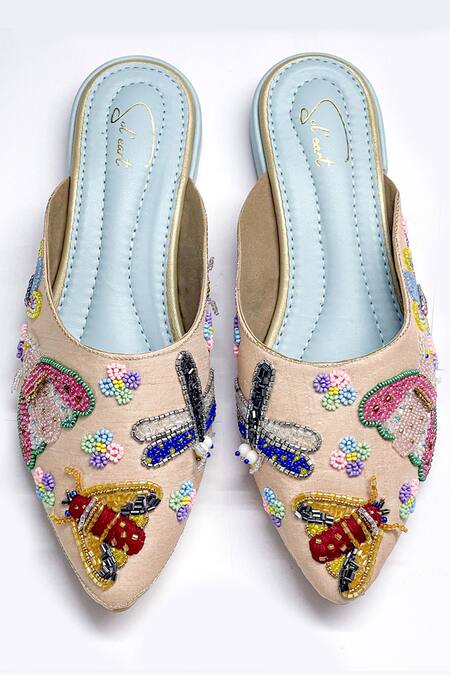 Peach mules featuring intricate bead embroidery in bug patterns and pointed toe detailing
