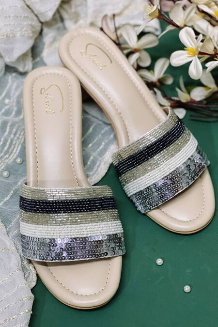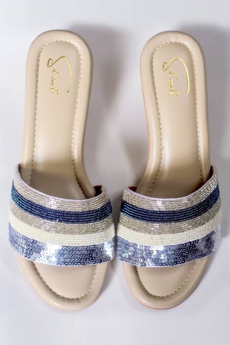 Silver and white block heels featuring cutdana, bead, and sequin embroidery