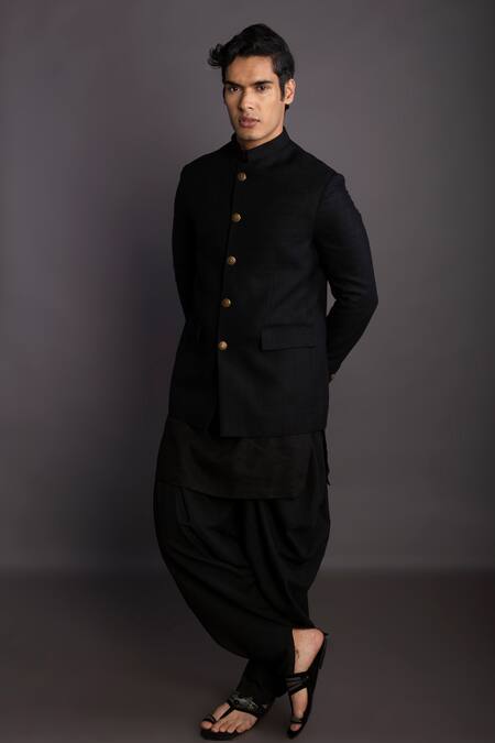 Black jodhpuri jacket with mandarin collar and flap pockets in front. Paired with a matching kurta and cowl pants.