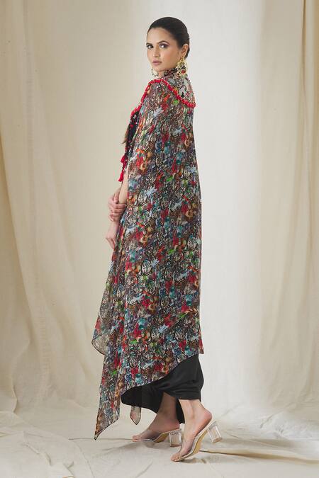 Black asymmetric dress paired with tassel overlay, abstract printed cape.