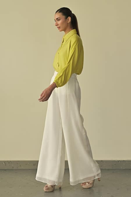 Double-layered shirt with crystal embroidered collar, High-waisted trouser with side pockets
