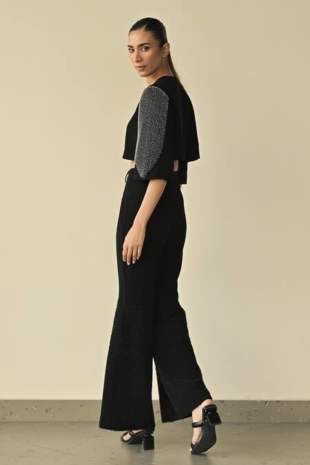 Black crop top featuring PVC cord embroidery on the three-quarter sleeves