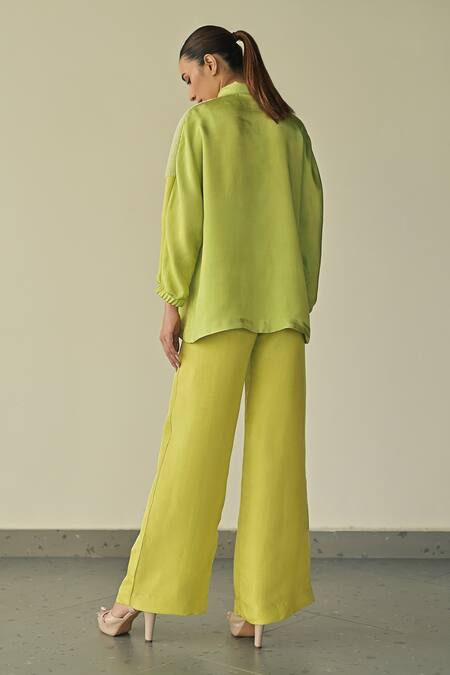 Monet green kimono style shirt featuring crystal embroidery and full sleeves. Paired with flared trousers highlighting jute seam details.