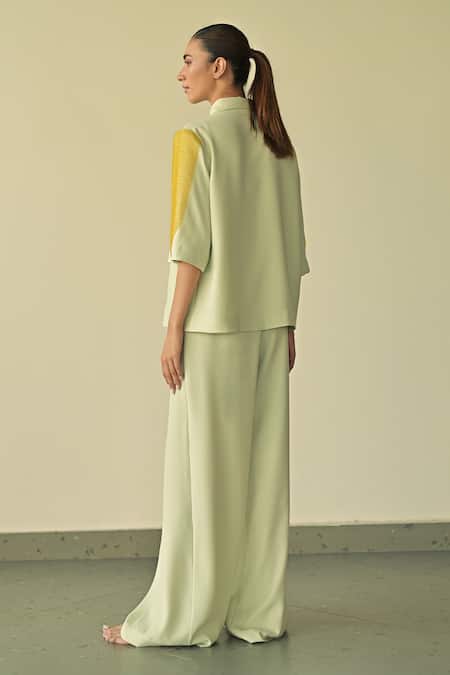 Mint green shirt featuring a collar neckline and three-quarter sleeves with PVC loop embroidery on the sleeves