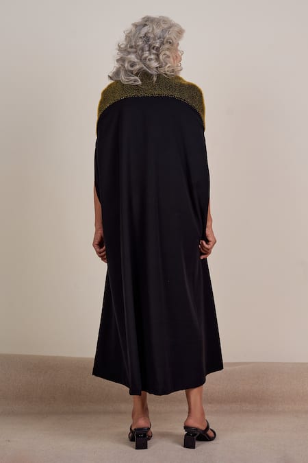 Black midi dress featuring a front twist knot embroidery on the shoulder