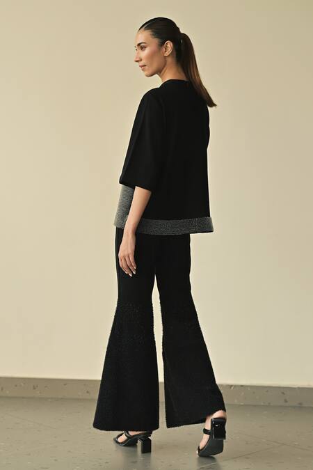 Black top featuring PVC loop embroidery in an asymmetric patch design