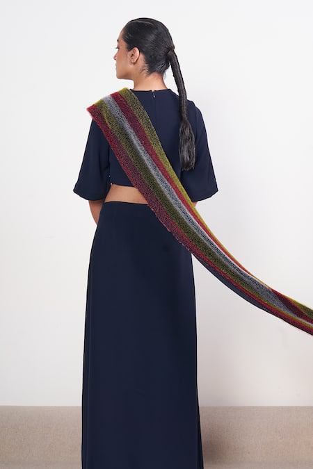 Blue blouse featuring a round neckline and three-quarter sleeves with a back zip closure. Paired with a matching pleated pre-draped saree skirt adorned with multicolour loop embroidery.