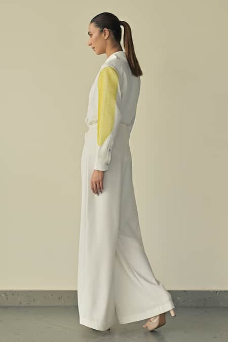 White shirt featuring crystals embroidered sleeves with collar neckline. Paired with high-waisted flared trouser with front seam and cut-out side pockets.