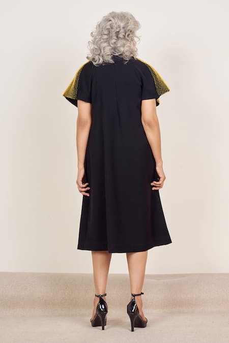 Blue A-line dress featuring hand looped PVC thread embroidery
