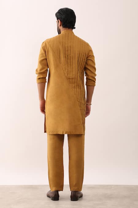 Mustard yellow kurta featuring asymmetric pleating texture detail. Paired with matching trousers for a complete look.