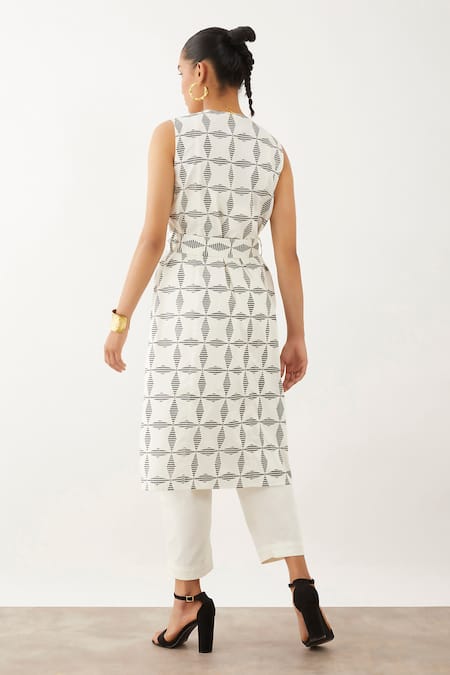 Off white fan print sleeveless jacket featuring an oversize lapel collar. Paired with solid trousers and a tie-up belt.