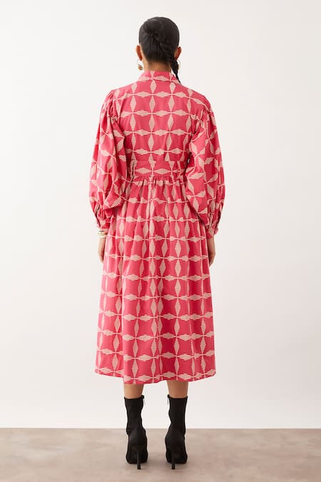 Pink Cotton Satin Collared Alexis Fan Print Dress