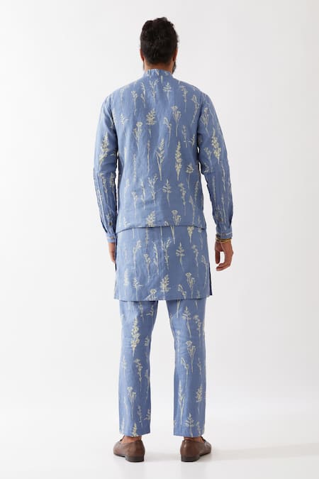 Blue bundi featuring botanical print all over with front pocket. Paired with a coordinating kurta and pant with pockets.
