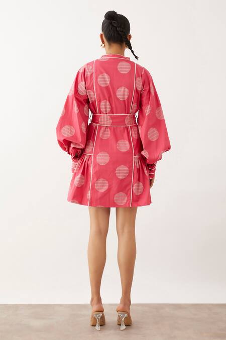 Pink Cotton Satin Mandarin Collar Clara Geometric Print Balloon Sleeve Dress