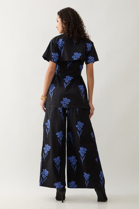 Blue Cotton Satin Collared Floral Print Relaxed Fit Shirt