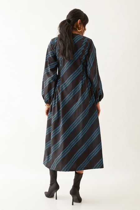 Black midi dress featuring carnival print with stitched-released pleats on the bodice