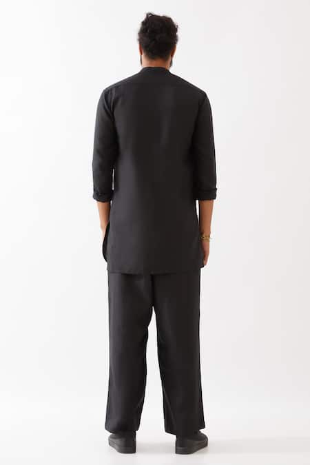 Black kurta featuring a mandarin neckline, overlapping & button details. Paired with matching trousers for a complete look.