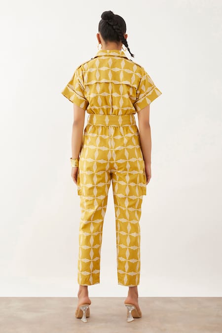 Brown jumpsuit featuring a bamboo fan print with a shirt collar and short sleeves