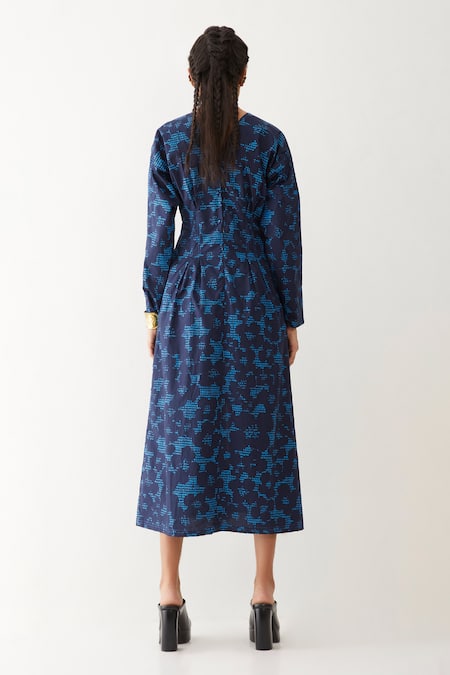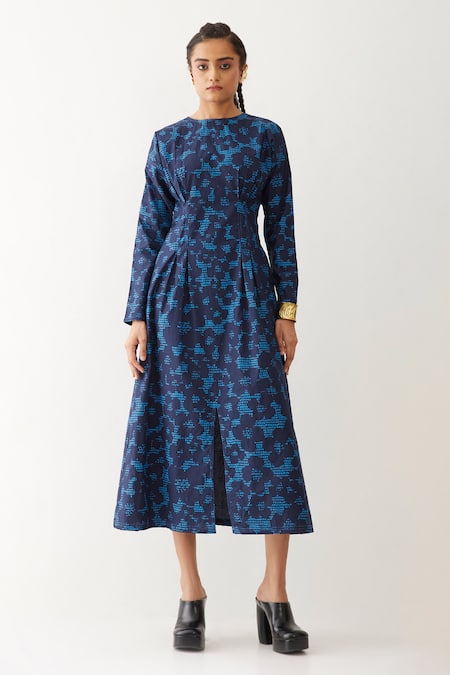 Blue Cotton Round Neck Lara Dot Print Sheath Dress